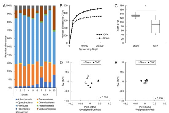 Dysbiosis in colon induced by ovariectomy. (A): Colonic microbial composition at the phylum level. (B,C): Alpha diversity analysis of the colonic microbiota. Rarefaction curve using the number of observed operational taxonomic units (B) and Faith’s phylogenetic diversity (C). (D,E): Beta diversity analysis of colonic microbiota Unweighted UniFrac (D) and weighted UniFrac (E). N = 5 per group. OTU: operational taxonomic unit, PD: phylogenetic diversity. * p < 0.05.