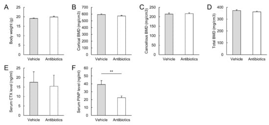 The effect of the gut microbiota on bone formation and BMD was examined after oral administration of antibiotics. Antibiotic administration did not change body weight (Figure 3A). Although tibial BMDs were not different between antibiotic-treated and vehicle-treated mice (Figure 3B–D), bone formation and resorption did not occur with antibiotic administration. Serum PINP levels were decreased to 57% after four weeks of treatment with a mixture of antibiotics compared to those in vehicle-treated mice. However, antibiotic administration did not affect serum CTX-1 levels (Figure 3E,F).