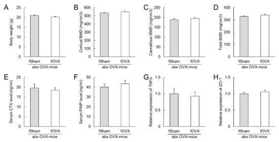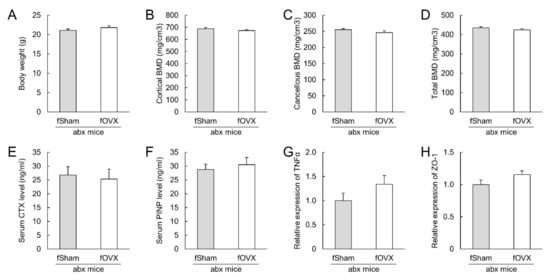 We investigated the role of commensal bacteria in osteoporosis with eight-week-old C57BL/6J female mice that were administered a mixture of antibiotics for four weeks: ampicillin (1 g/L; FUJIFILM Wako Pure Chemical Corp., Osaka, Japan), neomycin (1 g/L; FUJIFILM Wako Pure Chemical Corp.), metronidazole (500 mg/L; FUJIFILM Wako Pure Chemical Corp.), and vancomycin (500 mg/L; FUJIFILM Wako Pure Chemical Corp.) mixed in drinking water, to decontaminate the digestive tract (n = 7–10 per group). The control mice received normal drinking water. After the experimental period, blood and the left tibia were collected to assess bone homeostasis.