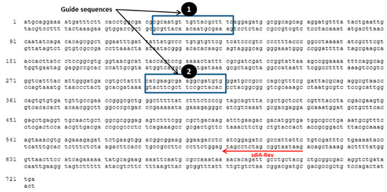 The guide sequences shown in Figure 1 were chosen for targeting sdiA, using a CRISPER/Cas system. Plasmids pCas9 and pCRISPR were digested by BsaI restriction endonuclease, and digested plasmids were gel-purified. The protocol provided by Addgene was followed to clone a spacer sequence into pCas9 and pCRISPR. Briefly, a spacer sequence of 20 bp was chosen upstream to NGG to be targeted by Cas9 nuclease and was designed with BsaI restriction cut site ends to be ligated directly to BsaI-digested pCas9 and pCRISPR. Oligonucleotides used for plasmids construction are listed in (Table 1). Oligo nucleotides I and II were designed to target the first site, and Oligos III and IV were designed to target the second site (Table 1). The Oligo nucleotides ordered to by synthesized from Sigma Custom DNA Oligos (St. Louis, MO, USA). Oligos I, II, III and IV were phosphorylated using T4 PNK enzyme. Phosphorylated oligo I was annealed to oligo II, and oligo III was annealed to oligo IV in 1M NaCl at 95 °C for 5 min and slowly cooled down to room temperature. Diluted annealed oligos I and II were ligated to BsaI-digested pCas9 plasmid, and the diluted annealed oligos III and IV were ligated to BsaI-digested pCRISPR plasmid. The ligated plasmids to spacer sequences were electroporated sequentially to S. enterica WT and ∆ssaV mutant competent cells. The transformed cells were grown at 37 °C for 1 h in LB broth containing kanamycin (50 µg/mL) and chloramphenicol (25 µg/mL). Then 100 µL was spread over LB agar containing kanamycin (50 µg/mL) and chloramphenicol (25 µg/mL) and incubated overnight at 37 °C to select the proper clones that harbor the plasmids carrying resistant genes to these antibiotics. For confirmation of proper cloning, the negative colony PCR clones, using oligo I or oligo III, and sdiA-Rev primer were chosen. PCR products were visualized by electrophoresis on agarose gel (0.7%), using 1X TAE (Tris-acetate-EDTA) running buffer at 80–120V, and visualized by 0.5 g/mL ethidium bromide.