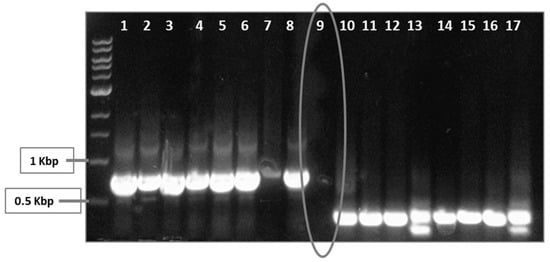 Screening for positive and negative clones, using PCR. Transformed S. enterica cells were selected on LB-kanamycin/chloramphenicol plates. Two plasmids were employed herein: The first plasmid, pCas9, encodes the Cas9, trcrRNA and crRNA to target guide sequence number 1. The other plasmid, pCRISPR, encodes crRNA for guide sequence number 2 to be targeted by Cas9. Both plasmids pCas9 and pCRISPR were transformed followed by selection on kanamycin and chloramphenicol-containing LB. However, there were background cells that lack the desired mutation. Colony PCR was performed by targeting both guide sequence 1, using oligo I and sdiA-Rev (wells 1–8), and guide sequence 2, using oligo III and sdiA-Rev (wells 10–17). Positive PCR clones were omitted, while negative ones (encircled well no. 9) were selected.