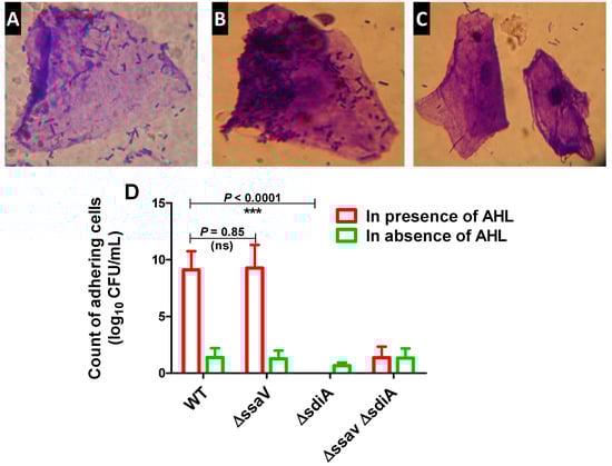 Monolayers of HeLa cells were cultured in 24-well plates in DMEM medium [46,47]. HeLa cells were passaged with 70% confluent and washed with sterile PBS before adhesion assay. Bacterial cultures S. Typhimurium WT, ∆ssaV, ΔsdiA and ∆ssaVΔsdiA (1 × 106 CFU/mL) and DMEM with or without N-hexanoyl-DL-homoserine lactone (AHL) in final concentration 0.001 µM were added to wells. Incubation was continued for 1 h at 37 °C. Next, epithelial cells were washed 3 times with PBS and lysed at room temperature for 20 min in Triton X-100 (1%). The bacterial suspensions were serially diluted, plated on TSA and incubated overnight at 37 °C for colony counting. The bacterial counts were used to evaluate adhesion rate. Experiment was performed in triplicate, and the means and standard deviations were calculated.