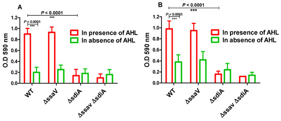 S. Typhimurium strains; WT, ∆ssaV, ΔsdiA and ∆ssaVΔsdiA were cultured with or without N-hexanoyl-DL-homoserine lactone AHL (0.001 µM) in polystyrene microtiter plate and incubated at 37 °C either for 1 h (for evaluation of adhesion) or for 24 h (for evaluation of biofilm formation) [45,47,48,49]. Incubated plates were washed gently 3 times with phosphate buffer saline (PBS), fixed at 60 °C for 25 min, stained with crystal violet (0.1%) for 15 min and finally washed with PBS. The adhered crystal violet was extracted with ethanol, and optical densities were measured at 590 nm. The assay was repeated in triplicate, and results were expressed as the means ± standard deviations.