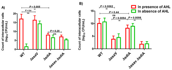 Internalization of S. Typhimurium strains within different cell lines was evaluated by using the gentamicin protection assay, as formerly described [50]. Briefly, 24-wells polystyrene plates were seeded with HeLa cells and/or RAW264.7 at cell density of 5 × 105 and 2 × 105 cells/well, respectively. Tested strains WT, ∆ssaV, ΔsdiA and ∆ssaVΔsdiA were subcultured from overnight cultures and incubated at 37 °C for 4 h to induce SPI1 conditions. A master-mix of the inoculum (1 × 105 bacteria/well) multiplicity of infection (MOI 1) for HeLa cell infection or raw macrophage was prepared in DMEM, and 300 μL was added to each well. The bacterial infections were performed in either in the absence or presence of N-hexanoyl-DL-homoserine lactone AHL (0.001 µM). Non-internalized bacteria were washed out with pre-warmed PBS after 30 min, and the adhered extracellular bacteria were killed by incubation in media containing gentamicin (100 µg/mL) for 1 h. For invasion assays, HeLa cells were lysed with 0.1% Triton X-100 for 10 min at 25 °C. To determine intracellular bacteria, the inoculum and the lysates were serially diluted and plated onto Mueller Hinton (MH) plates. The percentage of invading Salmonella (1 h against inoculum × 100) was calculated. To assay the intracellular replication, the infected cells were washed with PBS and lysed with TritonX-100 (0.1%) for 10 min in 25 °C at 2 and 16 h post-infection. The inoculum and the lysates were serially diluted and plated onto MH plates. The phagocytosed cells numbers/relative untaken cells (2 h against inoculum × 100) and x-fold intracellular replication (16 h against 2 h) were evaluated.