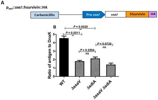 Plasmid pWsk29 PsseJsseJ::hSurvivin was transferred to WT, ∆ssaV, ΔsdiA and ∆ssaVΔsdiA strains. Tested mutants and expression rates were analyzed as described before [18]. Briefly, tested strains harboring plasmid expressing SPI2 effector protein SseJ-hSurvivin tagged with HA regulated by PsseJ promoter were cultured in SPI2-inducing minimal media (PCN-P, pH 5.8). Bacterial cells were collected by centrifugation after 6 h. Equal amounts of bacterial cells were lysed and exposed to SDS-PAGE. Western blots were used to detect HA epitope tag, using fluorescent-labeled secondary antibodies. The signal intensities were measured by using the Odyssey system (Li-Cor) in comparison to control DnaK (cytosolic heat shock protein). The experiment was performed in triplicate, and ratios of HA/DnaK signals were calculated and expressed as means ± standard deviation.