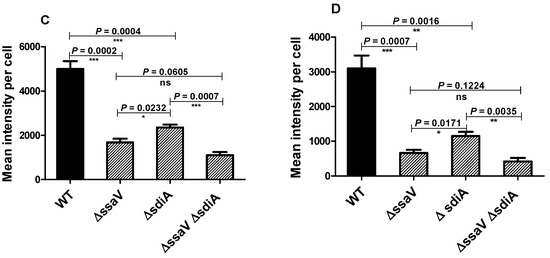 The efficiency of the SPI2-T3SS-dependent translocation in ΔsdiA strain was investigated herein. Salmonella tested strains harboring the constructed plasmid were used to infect HeLa cells or macrophages (in presence of AHL) and then were processed for immunostaining, and the fluorescence intensities of tagged protein were measured (Figure 7A,B). The translocated proteins were significantly reduced in S. enterica ∆ssaV and/or sdiA mutants, as compared to WT. Furthermore, the SPI2 effector translocation was significantly reduced in ΔssaV or ΔssaVΔsdiA strains when compared to ΔsdiA strains. There was no difference in the SPI2-effector translocation efficacy between S. enterica ΔssaV and ΔssaVΔsdiA (Figure 7C,D).