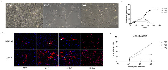 A sampling of organs from Pteropus bats was carried out to generate in vitro models to study henipaviruses in their natural reservoir. Since the respiratory system is the entry route for henipaviruses in susceptible species, the trachea and lungs were sampled during a necropsy. In addition, alary membrane skin bio punches, which could be easily sampled, were harvested from several individuals. After mechanical dissociation, explants derived from the trachea (PTC), lung (PLC), and alary membrane skin (PAC) were cultured in gelatin-coated wells in different cell culture media: epithelial, stem cell, or fibroblast medium. Proliferative cells emerged from PTC, PLC, and PAC explants at 5, 15, and 30 days after plating, respectively, in fibroblast medium (FM) or ES-derived medium (ESM1). All cells exhibited a fibroblast morphology, with an elongated and flattened shape (Figure 1a). The growth curves of the bPCs were established, and we observed that PACs entered senescence after 4 to 5 generations, while PLCs became senescent after 10–11 generations. By contrast, PTCs continued to proliferate for more than 30 generations (200 days of continuous culture), and then they slowly and progressively but irreversibly stopped proliferating (Figure 1b). Thus, explant cultures allowed to generate bPCs from trachea, lung, and alary membrane with fibroblast-like morphology and a limited life span in vitro.