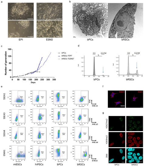 bRSC were shown to exhibit stem cell-like characteristics. bRSCs grew in compact colonies in both EPI and ESM medium, with morphology typical of pluripotent stem cells (PSCs): small and round, with a large nucleus, a high nucleo-cytoplasm ratio, and a prominent nucleolus (Figure 2a,b). Electron microscopy confirmed that the morphology and ultrastructure of bRSCs were very different from that of bPCs (Figure 2b). In particular, chromatin was distributed homogeneously throughout the nucleoplasm, without large zones of electron-dense heterochromatin that are typical of differentiated cells, and regularly observed in the nuclei of bPCs. The endoplasmic reticulum in bRSCs was abundant, but not dilated as in bPCs. In contrast to PCs, the bRSCs exhibit a long-term proliferation in both Epi and ESM2 media (Figure 2c). Cell cycle analysis of bRSCs revealed a PSCs-like profile with a short G2/M phase and a long S phase, unlike bPCs (Figure 2d). Expression of PSCs-specific antigens, including stage-specific embryonic antigens (SSEA-1, SSEA-3, and SSEA-4) and an epithelial membrane antigen (EMA-1) [37,38] was analyzed by immunostaining and flow cytometry (Figure 2e,f). Similar to murine embryonic stem cells (mESCs), but in contrast to human-induced pluripotent stem cells (hiPSCs), bRSCs were positive for SSEA-1 and EMA-1 and negative for SSEA-3 and SSEA-4. The nuclear distribution of some epigenetic marks in bRSCs was similar to the pattern observed in several PSCs types (Figure 2g). Indeed, the facultative heterochromatin marker H3K27me3 in bRSCs was distributed within several large foci, rather than being concentrated mainly at the inactivated X chromosome as in bPCs. Previously, such numerous prominent H3K27me3 foci were observed in both naïve mouse PSCs and pluripotent and reprogrammed avian cells [39]. Taken together, these different expression profiles strongly suggest that the following reprogramming, bRSCs share key features with PSCs from other species.