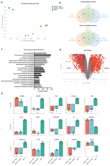 Molecular features of bat reprogrammed stem cells (bRSCs). (a) Principal component analysis (PCA) of RNA-seq results for bPCs and bRSCs. Principal Component 1 (PC1, x-axis) represents 60.56% and PC2 (y-axis) represents 25.29% of the total variation in the data. (b) Venn diagram of differentially expressed genes (DEGs) between bPCs and bRSCs cultured in “EPI” or “ESM2” medium. The numbers of common DEGs between the two bRSCs cultures are in bold. (c) Gene ontology (GO) term enrichment analysis of DEGs in bRSCs. The terms with the best FDR value were selected. Dark gray represents the GO biological process and light gray represents the GO cellular component. (d) Volcano plot representation of DEGs in bPCs versus bRSCs comparison. Red dots represent all DEGs with fold change >3 and blue dots represent DEGs corresponding to interferon-stimulated genes (ISGs). (e) Bar graphs of the relative expression levels of selected genes between bPCs and bRSCs in “EPI” and “ESM2” medium: EFNB2, DDX58, IFIH1, LGALS9, IFI6, IL1R1, CD40, TRAF3IP2, IL6, NFKBIB, TNFSF10, FAS, CASP8, CASP10, and BCL2.