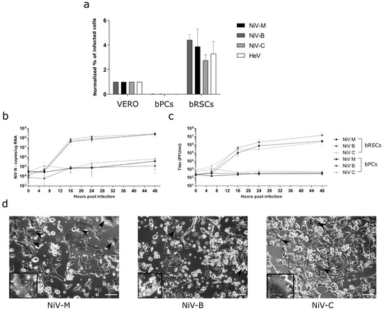 For NiV-M, NiV-B, and NiV-C, bPCs, and bRSCs were plated in 12-well plates and upon reaching 80% of confluence were infected for 1 h at 37 °C with the virus at an MOI of 0.1 (as the infection was saturating at an MOI of 1) using the highest biocontainment environment (BSL4). Next, the virus-containing medium was removed and cells were washed once with PBS. Finally, fresh medium was added to cells, followed by incubation at 37 °C for 0, 6, 16, 24, or 48 h. Cell morphology was observed under a Zeiss Axiovert 100 M microscope and photos were taken at 24 h post-infection using ImageJ software. For each time point, infected cell lysate was prepared using RLT buffer (Qiagen, Les Ulis, France, Cat# 79216) prior to RT-qPCR analysis according to a validated BSL-4 procedure. The supernatant was collected and kept at −80 °C until titration in a plaque assay on Vero E6 cells. Infections and titrations were performed in a BSL-4 facility at Jean Mérieux (Lyon, France). At the indicated time points, lysates prepared from infected cells were collected and RNA extracted using the NucleoSpin RNA kit (Macherey-Nagel, Hoerdt, France, Cat# 740955). The yield and purity of extracted RNA were assessed using a spectrophotometer (DS-11 FX; Denovix, Wilmington, DL, USA). Extracted mRNA was reverse-transcribed using SuperScript™ III Reverse Transcriptase (Invitrogen, Thermo Fisher Scientific, Illkirch, France, Cat# 18080). Real-time PCR was performed using Platinum SYBR Green qPCR SuperMix-UDG kit with ROX reference dye (Thermo Fisher Scientific, Illkirch, France, Cat# 11733038) and the StepOne plus PCR system (Applied Biosystems, Thermo Fisher Scientific, Illkirch, France). Data were analyzed using StepOne v.2.3 software (Applied Biosystems, Thermo Fisher Scientific, Illkirch, France,) and calculations were done using the 2ΔΔCT method. Expression was normalized to that of glyceraldehyde 3-phosphate dehydrogenase (GAPDH), as described previously [36]. The primers used are pGAPDH forward: ATCATCCCTGCTTCTACT and reverse: AGGTCAGATCCACAACT; and NiV-N forward: GGCAGGATTCTTCGCAACCATC and reverse: GGCTCTTGGGCCAATTTCTCTG.