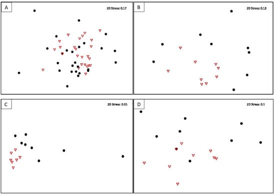 Nonmetric multidimensional scaling (MDS) plot showing endophytic fungal communities from old and young plants. (A) All plant organs, (B) roots, (C) stems and, (D) leaves of Pseudowintera colorata. Fully mature/old plant: ●; Young plant ∇.