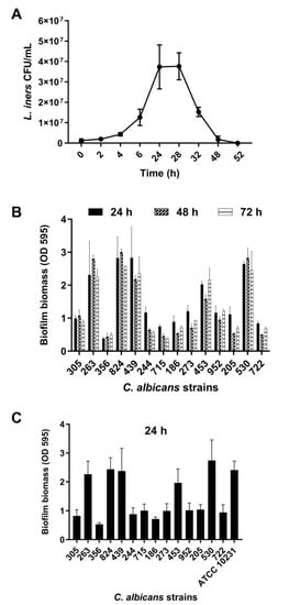 Figure 1. (A) Growth curve of Lactobacillus iners. L. iners ATCC 55195 was incubated for 52 h in brain heart infusion (BHI) broth, and bacterial growth was determined at selected time points. Values represent mean ± SEM of colony-forming units (CFU)/mL from three independent experiments performed in duplicate. (B) Biofilm formation by Candida albicans clinical isolates in vitro. The isolates were grown for 24, 48, and 72 h. Biofilm biomass was evaluated using the crystal violet staining method, and values represent mean ± SEM of absorbance at OD595. Data are from at least three independent experiments with n = 6. (C) Biofilm formation by C. albicans clinical isolates in vitro in RPMI 1640 + BHI broth. Biofilms were grown for 24 h using 1:1 RPMI 1640 and BHI broth. Values represent mean ± SEM of absorbance at OD595 from at least three independent experiments with n = 6.
