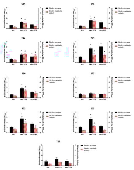 Figure 2. Effect of Lactobacillus iners cell-free supernatant (CFS) on in vitro biofilm formation by Candida albicans clinical isolates characterized as moderate (305, 244, 715, 186, 273, 952, 205, 722) and weak (356) biofilm producers. Biofilms of C. albicans clinical isolates were grown for 24 h using RPMI 1640 + BHI broth or 24/48 h L. iners CFS in a 1:1 ratio. Biofilm biomass was evaluated using the crystal violet staining method (OD595, black bars, left y-axis), and metabolic activity was determined using the XTT reduction assay (OD490, red bars, right y-axis). Values represent mean ± SEM of at least three independent experiments performed in triplicate. Statistically significant differences were tested using one-way analysis of variance or Kruskal–Wallis test. * p < 0.05 biomass of biofilm grown with 24/48 h L. iners CFS vs. control biofilm biomass (BHI). # p < 0.05 metabolic activity of biofilm grown with 24/48 h L. iners CFS vs. control biofilm metabolic activity (BHI).