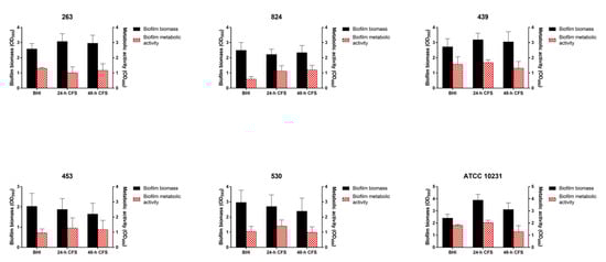 To evaluate the effects of L. iners CFS on C. albicans biofilm formation, 100 µL of 24 or 48 h CFS in BHI was mixed with 100 µL of each C. albicans isolate and C. albicans ATCC 10231 reference strain (1 × 107 CFU/mL) in RPMI 1640, followed by incubation for 24 h, as described earlier. Biofilm quantification was performed by biofilm biomass and metabolic activity determination. As is evident from Figure 2, seven of the nine moderate or weak biofilm producers displayed a significant increase in biofilm biomass and metabolic activity in the presence of L. iners 24 h CFS, whereas only two isolates (244 and 715) showed an increase in these parameters in the presence of L. iners 48 h CFS.