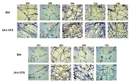 The biofilm morphology of all the moderate/weak isolates (n = 7) which showed an increase in both biofilm formation as well as filamentous growth was further microscopically analyzed at magnification 400×. Relative to respective controls (BHI), in the presence of L. iners 24 h CFS, we observed that apart from the clinical isolate 186 that formed a biofilm predominantly composed of clusters of yeast cells and pseudohyphae, and the strains 952 and 715, which formed true hyphae, all the remaining strains tested produced biofilms that were composed of both the filamentous forms (Figure 5). In addition, for all moderate/weak biofilm producers, we investigated the effects of pH on pseudohyphal/hyphal growth induced by L. iners 24 h CFS. We observed C. albicans biofilm formation at pH 4.9. All tested strains failed to produce hyphae, and thus, resultant biofilms were composed of only clusters of yeast cells (data not shown).