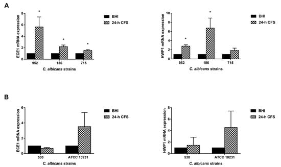 Figure 6. Effect of Lactobacillus iners 24 h cell-free supernatant (CFS) on the expression of hyphal-specific genes of Candida albicans clinical isolates and C. albicans ATCC 10231 reference strain. Total RNA was extracted from biofilms grown with or without 24 h L. iners CFS, retrotranscribed into cDNA, and real-time PCR was performed to assess expression of ACT1, ECE1, and HWP1. (A) Relative gene expression levels of ECE1 and HWP1 of three C. albicans clinical isolates characterized as moderate biofilm producers and (B) one characterized as strong biofilm producer with the ATCC 10231 reference strain. Data were analyzed using the 2−ΔΔCt method, and values represent mean ± SEM of three (panel A) and two (panel B) independent experiments performed in triplicate. Statistically significant differences were tested with paired Student’s t-test or Wilcoxon matched-pairs signed-rank test. * p < 0.05 relative gene expression of 24 h L. iners CFS-treated biofilms vs. control biofilms.