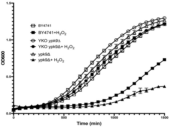 Frozen stocks of strains were used to prepare fresh streaks on YPD agar plates, samples of which were used to inoculate 5 mL of YPD with or without antibiotics, and the cultures were rotated overnight at 30 °C. Cultures were diluted to 0.05 OD600 and three 200 μL aliquots of each strain were placed in a sterile 96-well microplate. For background correction, certain wells contained only medium. Cultures were incubated in a Sunrise Tecan microplate reader at 25 °C for 2 h with shaking. Hydrogen peroxide (50 µM final concentration) or water was added to the cultures and the incubation was continued for a total of 24 h. The OD600 was recorded in 15 min intervals.