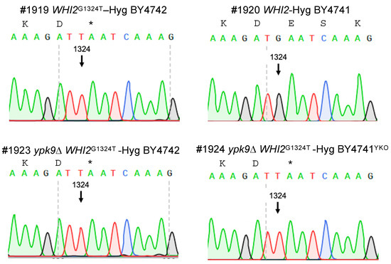 Sequence confirmation of engineered WHI2 variants. A hygromycin cassette was fused to WHI2 or its variant containing a stop codon at position 1324 (WHI2G1324T) and used to replace the endogenous version of WHI2 in BY4741COM, BY4742, and YKO collection’s ypk9∆ in BY4741YKO. DNA sequencing was used to confirm the replacement. The asterisk represents the stop codon. Numbers with a hashtag represent the laboratory strain identification number.