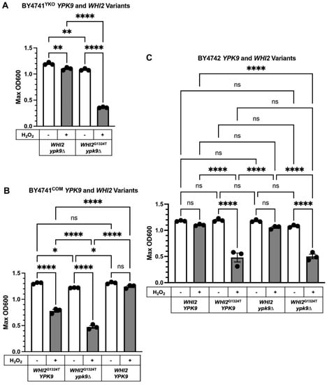 Effect H2O2 on the growth of WHI2 and YPK9 variants in different background strains. (A) WHI2 variants in the YKO collection’s ypk9∆ in BY4741YKO. (B) WHI2 variants in BY4741COM. (C) WHI2 and YPK9 variants in BY4742. Hygromycin (Hyg) was used to select for gene replacement. The OD shown is the maximum recorded during 25 h of growth. Results were analyzed using one-way ANOVA and Tukey’s post hoc test. Error bars represent the SEM, n = 3. Asterisks represent p-values: * 0.03332, ** 0.0021, **** < 0.0001; ns, not significant.