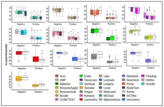 Box-plots of Ct values distributions according to different batches of validation series. Figure 1 legend. RATs were grouped according to the validation series. For each series, there was one internal reference (Standard Q®, white box-plot). Black solid lines represent the Ct medians, box-plots and whiskers represent the Ct values distribution. RATs results are displayed on the x-axis: Negative or Positive. Cycle thresholds (Ct) are shown on the y-axis.