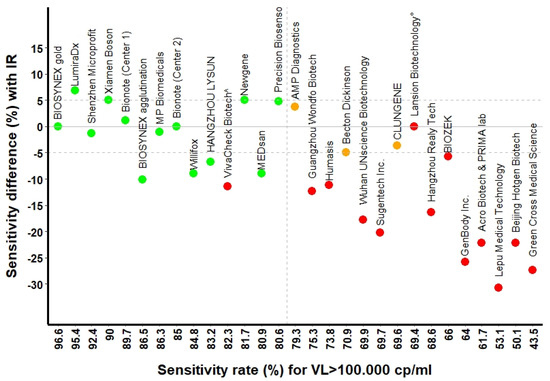 RATs sensitivity rates for viral loads above 105 copies/mL compared to the internal reference test. Figure 2 legend. Green and red dots represent the assays passing and not passing FOPH validation criteria, respectively; orange dots represent the assays validated using the non-inferiority criteria to the internal reference. The solid line represents the internal reference (Standard Q®, SD Biosensor/Roche). Dashed horizontal lines represent the limits of difference in percentage within which sensitivity rates’ variations were considered acceptable compared to the IR. The vertical dashed line coincides with 80% cut-off, which was considered the minimal sensitivity threshold for FOPH validation above 105 copies/mL of viral load. ^: this test did not pass the validation criteria for insufficient sensitivity at viral loads above 106–107 copies/mL. °: this test did not pass the validation because of lack of specificity.