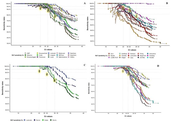 Three RATs (AMP Diagnostics, LUNGENE and Becton Dickinson) were validated based on non-inferiority criteria (sensitivity ≤ 5%) to the internal reference. In the end, 15/30 RATs did not pass the validation criteria (Table 2), most of them due to insufficient sensitivity. For Ct values of 29 or higher (roughly 105 copies/mL and lower), RATs generally showed sensitivities below 65% (Table 1 and Table 2, Figure 3A,B).