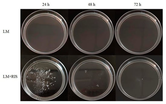 Our previous research indicated that R. insidiosa induced suspended aggregate formation of L. monocytogenes under nutrient-poor environments (10% TSB) at low speed [16]. Then 10% RIS was used instead of R. insidiosa to carry out the experiment. L. monocytogenes did not form suspended aggregates after culturing at low speed (60 RPM) for 72 h (Figure 1). However, in the presence of 10% RIS, L. monocytogenes formed suspended aggregates after low-speed culture for 24 h (Figure 1). The suspended aggregates in the broth were scattered and small in volume. After 72 h of continuous cultivation, the suspended aggregates gradually disappeared, and the suspended aggregates reached the maximum volume at 24 h of cultivation. This is a new observation and the first demonstration that aggregation can be induced by cell-free supernatants.