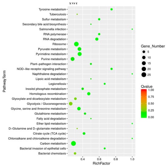 Scatter plot of Kyoto Encyclopedia of Genes and Genomes (KEGG) pathway enrichment for DEGs. The number of DEGs in each pathway is closely related to the size of dots, and the color of dots reflects different Qvalue values. Rich factor was positively correlated with enrichment degree. The smaller the Qvalue, the more significant the enrichment.