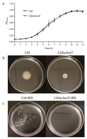 (a) Growth curves of L. monocytogenes and L. monocytogenes ΔcheAY at 37 °C. (b) Motility of L. monocytogenes and L. monocytogenes ΔcheAY in semisolid agar. L. monocytogenes and L. monocytogenes ΔcheAY were stabbed into semisolid agar plates (TSB plus 0.3% agar). The plates were cultured at 28 °C for 48 h. (c) Suspended aggregates formed by L. monocytogenes and L. monocytogenes ΔcheAY with the presence of 10% RIS in 10% TSB at 28 °C for 24 h.