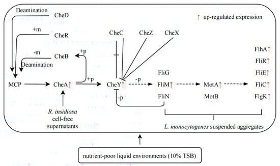 Based on the results discussed above, the regulatory network of suspended aggregates formed by L. monocytogenes with the presence of 10% RIS was summarized in nutrient-poor environments (Figure 6). L. monocytogenes was stimulated by one or more component in 10% RIS when it is in nutrient-poor liquid environments. Then histidine kinase CheA, which acts on both TCS and bacterial chemotaxis, was activated and autophosphorylated. CheY then received the phosphate group from CheA to form phospho-CheY, which acts on TCS and bacterial chemotaxis pathway. Phospho-CheY binds to proteins in the flagellar motor switch complex, which consists of FliM, FliN and FliG, resulting in increased expression of flagellar assembly related genes (fliM, motA, fliC, etc.). The rotation direction of flagella is affected, and the original clockwise direction is replaced by counterclockwise direction. The clockwise rotation of the flagellum makes the cell rotate in place and remain stationary, while the counterclockwise rotation makes the flagellum form a single rotating bundle and produce smooth swimming behavior [38]. Under the condition of low-speed culture, the change of rotation direction makes L. monocytogenes physically move in a certain direction and may eventually result in the formation of suspended aggregates.