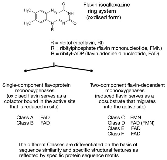 Monooxygenases that deploy one or more flavin moieties (riboflavin [Rf], flavin mononucleotide [FMN], and flavin adenine dinucleotide [FAD]) as an integral contributor to their mode of action can be subdivided into two major groups (Figure 1, [1]). Single-component flavoprotein monooxygenases, which have been studied for several decades, are true flavoprotein enzymes that contain one or more tightly-bound oxidised flavin moieties serving as cofactors in the active site which are directly reduced in situ by NAD(P)H sourced from one or more separate complementary enzymes. Conversely, the functionally distinct flavin-dependent two-component monooxygenases (fd-TCMOs, [2]) are an emerging group of enzymes that are not true flavoproteins as they contain no bound flavin, but rather deploy a reduced flavin as a preformed cosubstrate sourced externally either by a sequential or ping-pong reaction mechanism [3] from one or more separate NAD(P)H;flavin oxidoreductases [4].