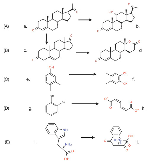 (A–E) Examples of the earliest confirmed O2-dependent enzymes assayed in either whole-cell or cell-free systems. a. progesterone; b. 11⍺-hydroxyprogesterone; c. 4-androstene-3,17-dione; d. testololactone; e. 3,4-dimethylphenol; f. 4,6-dimethyl-catechol; g. catechol; h. cis,cis-muconate; i. tryptophan; j. N-formylkynurenine.