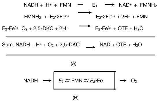 (A). Proposed reaction sequence for the combined action of E1 and E2 [41]. (B). Cartoon depicting the proposed functional complex between E1 and E2 [41]. E1 = NADH oxidase; E2 = 2,5-DKCMO; 2,5-DKC = 2,5-diketocamphane; OTE = 2-oxo-△3,4-4,5,5-trimethylcyclopentenylacetic acid.