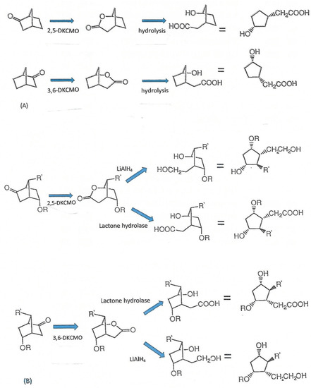 Generation of enantiocomplementary substituted cyclopentanes with multiple chiral centres by deploying DKCMO-catalysed biotransformations of either (A) unsubstituted (=2 chiral centres) or (B) bisubstituted (=4 chiral centres) bicyclo[2.2.1] ketones as a key step.