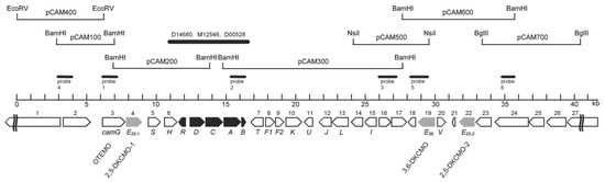 Localization of additional genes and predicted open reading frames (ORFs) flanking the established initial genes of the camphor camDCAB operon and its repressor, camR, on an~40.5-kb established sequenced region of the CAM plasmid of P. putida ATCC 17453. The predicted ORFs or genes are sequenced numbered from 1 to 27, except for the established camRDCAB genes, which are shaded in black. The numbered from 1 to 27, except for the established camRDCAB genes, which are shaded in black. The orientation of the arrows indicates the direction of gene transcription. The candidate genes of this study (camE25–1, camE25–2, and camE36) representing the three diketocamphane monooxygenase (DKCMO) isozymes are highlighted in grey. The previously established OTEMO-encoding gene been designated camG in accordance with the respective catabolic step. Figure reproduced from Iwaki et al. [44] with permission. American Society for Microbiology, licence number 4487631509592.
