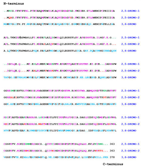 Protein sequence alignment of the oxygenating subunits of 2,5-DKCMO-1 (orf-4, camE25-,) 2,5-DKCMO-2 (orf-22, camE25-2) and 3,6-DKCMO (orf-19, camE36). Amino acid residues: common to 2,5-DKCMO-1, 2,5-DKCMO-2, and 3,6-DKCMO = black; common to 2,5-DKCMO-1 and 2,5-DKCM-2 = magenta; exclusive to 2,5-DKCMO-1 = green; exclusive to 2,5-DKCMO-2 = red; exclusive to 3,6-DKCMO = blue.