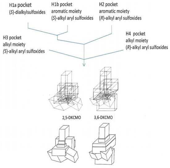 An indirect consequence of Iwaki et al.’s pioneering 2013 studies [44] was that the resultant knowledge of the primary structures of all the DKCMO isoenzymes resparked interest in determining their corresponding three-dimensional structures. Historically, surprisingly little relevant information on structural features of the isoenzymic ketolactonases had been published. The one exception was a 1998 study [59] that deployed so-called ‘cubic space models’ [78] to develop three-dimensional (3D) representations of the active sites of the enantiocomplementary DKCMOs based on the outcomes of biotransformation conducted with twenty-three organosulphide substrates (Figure 9). This study had its strengths and weaknesses. With hindsight, it has to be appreciated that the representation generated for 2,5-DKCMO represent a collage of the outcomes from 2,5-DKCMO-1 and 2,5-DKCMO-2. However, the study has significant merit because the DKCMOs, like other enzymes, undergo sequential structural changes during catalysis [79], and a strength of this approach is that the resulting models reflect the relative extent of relevant dynamic structural changes for the DKCMOs. It was also clear from this 1998 study that the substrate-binding active site of 3,6-DKCMO was significantly larger than that of 2,5-DKCMO, which may correspond with 3,6-DKCMO being confirmed to be the larger protein by Iwaki et al.’s study [44].