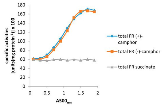 Specific activity of total flavin reductase (FR) throughout the growth of P. putida ATCC 17543 on either (+)-camphor, (−)-camphor, or succinate as sole carbon source.