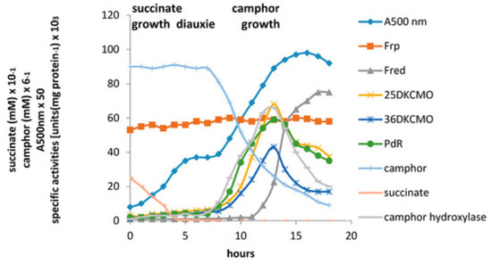 Changes in the optical density (A500nm), succinate (mM), (rac)-camphor (mM), and the specific activity of key enzymes of (rac)-camphor degradation during diauxic growth of by P. putida ATCC 17453 on succinate plus (rac)-camphor based defined medium. Camphor hydroxylase = camphor 5-monooxygenase.