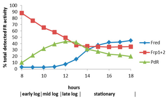By reformatting the data from the diauxic growth study, a picture could be gained of the relative contribution of the different assayed FMNH2-generating enzymes to the total flavin reductase activity titre throughout the progressive phases of the camphor-dependent growth of P. putida ATCC 17453 (Figure 12). The outcome confirmed the initially predominant importance of the combined constitutive Frp1 and Frp2 activities at the onset of camphor-dependent growth. However, this predominance was progressively diminished throughout early and mid log trophophasic growth by the steady incremental induction of the CAM plasmid-coded PdR activity. Thereafter, these three flavin reductase activities progressed to assume approximately equal importance during the late log phase in the growth cycle, before the relative importance of PdR declined significantly as induction of the protein is down-regulated after exit from trophophase into idiophase (stationary phase). Contrastingly, the titre of chromosome-coded camphor-induced Fred only began to assume any importance during the very late log phase of trophophasic growth, but then progressed to become the predominant FMNH2-generating activity following entry into idiophase, a profile matched concomitantly by the declining titres of PdR and, as evident from Figure 11, both DKCMOs. This time course for the up-regulation of Fred is more consistent with that of an enzyme involved in secondary (idiophasic) rather than primary (trophophasic) metabolism [95]. It is relevant in this respect that species of P. putida are known to produce a wide range of indigenous secondary metabolites [96], including various polyketides [97], for which fd-TCMOs are known to play important roles as ‘tailoring enzymes’ [98,99,100].