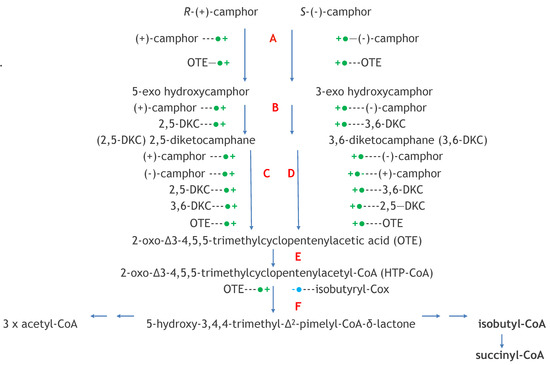 - Jacobson, L.A. Enzyme Induction and Repression in the Catabolism of (+)–Camphor by Pseudomonas putida. Ph.D. Thesis, University of Illinois, Champaign, IL, USA, December 1967. [Google Scholar]