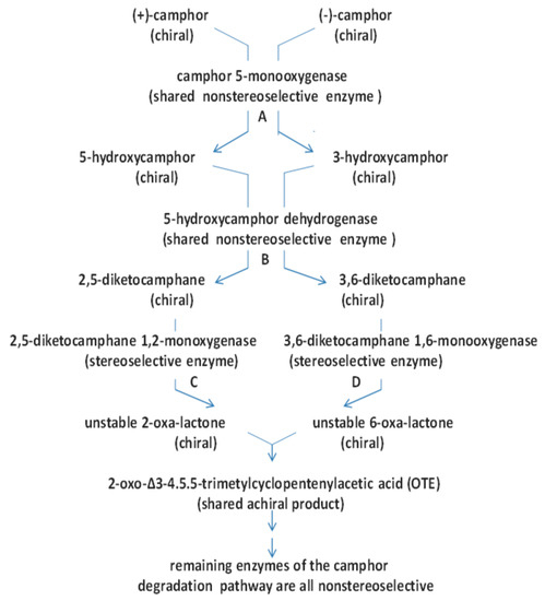 The relationships between nonselective and stereoselective enzymes that constitute the pathway for the degradation of (rac)-camphor to OTE in P. putida ATCC 17453, and the roles of chiral and achiral molecules as substrates and transcriptional regulators. A = induction by (+)-camphor and (−)-camphor, plus product induction by OTE: B = induction by (+)-camphor and (−)-camphor, plus product induction by 2,5-DKC and 3,6-DKC: C = induction by (+)-camphor, (−)-camphor and 2,5-DKC, plus cross-induction by 3,6-DKC, and product induction by OTE: D = ‘from the top’ coordinate induction by (+)-camphor, (−)-camphor, and 3,6-DKC, plus cross-induction by 2,5-DKC, and product induction by OTE: A + B + C + D = ‘from the top’ coordinate induction by (+)-camphor and (−)-camphor.