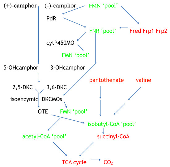 The most recent contribution to the sporadic six-decade history of the DKCMOs has been the confirmation for the first time that the 533 kb CAM plasmid of P. putida ATCC 17,453 can function as a totally autonomous extrachromosomal genetic element [8]. This was a proposal with its origins in Gunsalus’s early quest to characterise the role of oxygen-dependent enzymes in the biogeochemical carbon cycle (vide supra). His interest was fuelled further when his studies in the early 1970s [74] confirmed that an enzyme suite coded for by the CAM plasmid of P. putida ATCC 17453, which included four different monooxygenases, was able to catabolise C10 (+)-camphor to three molecules of C2 acetyl-CoA plus one molecule of C4 isobutyryl-CoA. Acetyl-CoA is a key metabolite that is the common end product of a significant number of universal chromosome-coded central intermediary metabolic pathways, and facilitates entry into the CO2-generating TCA cycle [113]. Similarly, isobutyryl-CoA is a shared intermediate with the catabolic pathways for pantothenate and valine, both chromosome-coded pathways in pseudomonads [113]. Irrespective of its metabolic origin, isobutyl-CoA can be further catabolised by chromosome-coded enzymes to the C4 TCA cycle intermediate succinyl-CoA [114]. Collectively, these activities account for every atom of C10 camphor gaining entry into the CO2-generating TCA cycle (Figure 15), thereby supporting Gunsalus’s metabolic autonomy proposal.