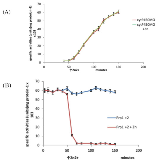 Changes in the activity of (A) camphor 5-monooxygenase (cytP450MO), and (B) the combined Frp1 + Frp2 activity in P. putida ATCC 17453 in the presence and absence of 30 µM Zn2+ added during the diauxic interlude that occurs between the swop from late log growth on succinate to early log growth on (rac)-camphor.
