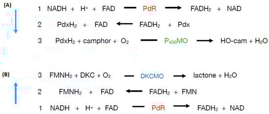 Schematic of the two contrasting roles of putidaredoxin reductase (PdR) in camphor-grown P. putida ATCC 17453. (A). cytP450MO (camphor 5-monooxygenase): Pdx (putidaredoxin) (B). 2,5-DKCMO (2,5-diketocamphane 1,2-monooxygenase): DKC (2,5-diketocamphane).
