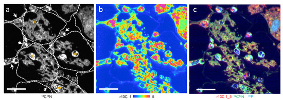 In the onion roots, G. margarita form Arum-type mycorrhiza where intercellular hyphae grow between the host cell and form an arbuscule within cortical cells (Figure 1). Arbuscule-forming hyphae, including a thick trunk and fine branches, were surrounded by the peri-fungal membrane derived from the host plasma membrane. An r13C higher than natural abundance was observed in the mycorrhizal root, especially associated with the host and arbuscule complex and intercellular hyphae (Figure 1a–c). An overlay image of r13C (red), 12C14N (green), and 31P (blue) showed the plant nucleus as light blue (Figure 1c).