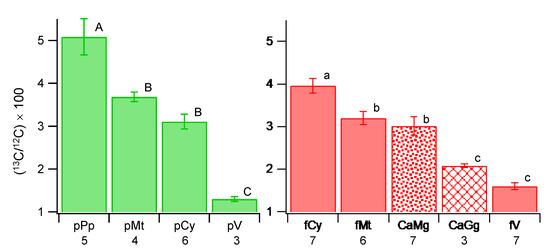 Multiple comparison of 13C ratios of plant structures (left) and fungal structures and endobacteria (right). CaGg, Candidatus Glomeribacter gigasporarum; CaMg, Candidatus Moeniiplasma glomeromycotorum; fCy, fungal cytoplasm; fMt, fungal mitochondrion; fV, fungal vacuole; pCy, plant cytoplasm; pMt, plant mitochondrion; pPp, plant plastid; pV, plant vacuole. The averages of the structures were obtained in each image, which was used for the multiple comparison tests (Tukey–Kramer method), which were conducted in the plant and fungal structures separately. Different letters show statistically significant differences among structures (plant, A–C; fungal and bacteria, a–c) based on the Tukey–Kramer method at p < 0.05. Bar, standard error of the mean (N = number of images analyzed in the structure—shown under each structure).