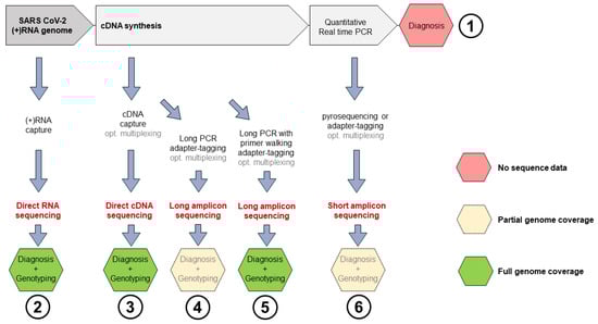Nanopore sequencing options (2–6) compatible with diagnostic qPCR pipelines (1). The pyrosequencing option in the path (6) requires biotin-tagged primers for qPCR [].