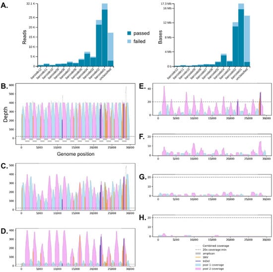 Installation and usage of interARTIC pipeline were done following the developers’ instructions: InterARTIC Documentation. Available online: https://psy-fer.github.io/interARTIC/installation/ (accessed on 14 December 2021). For faster analysis, all available threads were activated in the advanced settings. The interARTIC pipeline performs read filtering, alignments and returns a consensus FASTA file as well as coverage charts for visualization (Figure 2B–H).