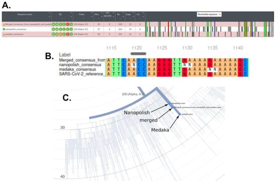 Comparison of the consensus sequences returned by ‘Nanopolish’ and ‘Medaka’ algorithm and the merged consensus for a nanopore sequencing run corresponding to a viral load of 1.28 × 106. (A) Alignment of the ‘Nanopolish’ and ‘Medaka’ consensus as well as the merged consensus on the SARS-CoV-2 reference genome by the Nextstrain program. The merged consensus conserved all of the high-quality mutations that mapped to the known variant 20I (shown in color or light grey), while most non-matching mutations (in dark grey, likely sequencing errors) of the ‘Nanopolish’ or ‘Medaka’ consensus were lost; (B) Comparison of variant solving by ‘Nanopolish’, ‘Medaka’ and our code. The multiple alignments were performed by MAFFT online tool with the three consensus sequences and the SARS-CoV-2 reference genome (MN908947.3). Contrary to the ‘Nanopolish’ and ‘Medaka’ consensus, the merged consensus solved the entire region and led to accurate variant calling; (C) Clade mapping and phylogenetic distances calculated by Nextstrain for the three consensus sequences.